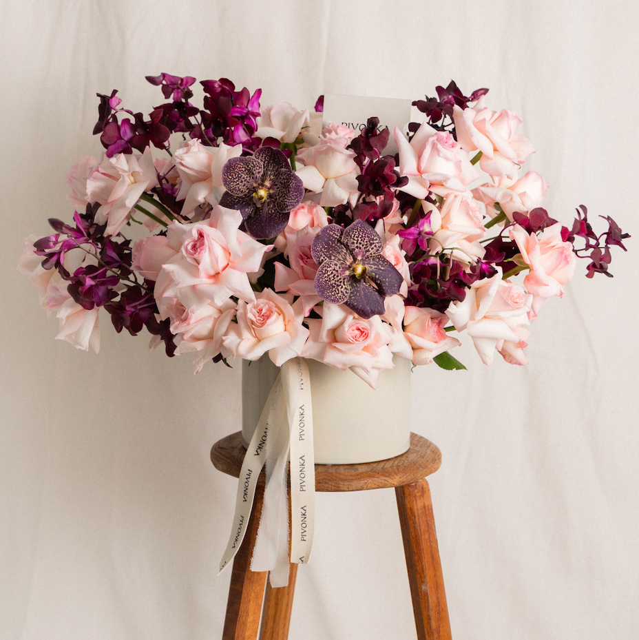 Arreglo en tonos rosas y morados. Rosas, orquídeas dendrobium y orquídea vanda hacen la combinación perfecta para sorprender a quien sea.