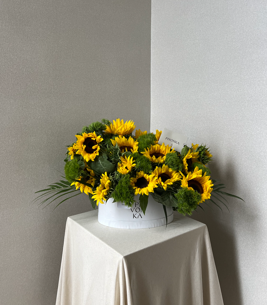 Arreglo de girasoles combinado con follajes finos en caja ovalada.